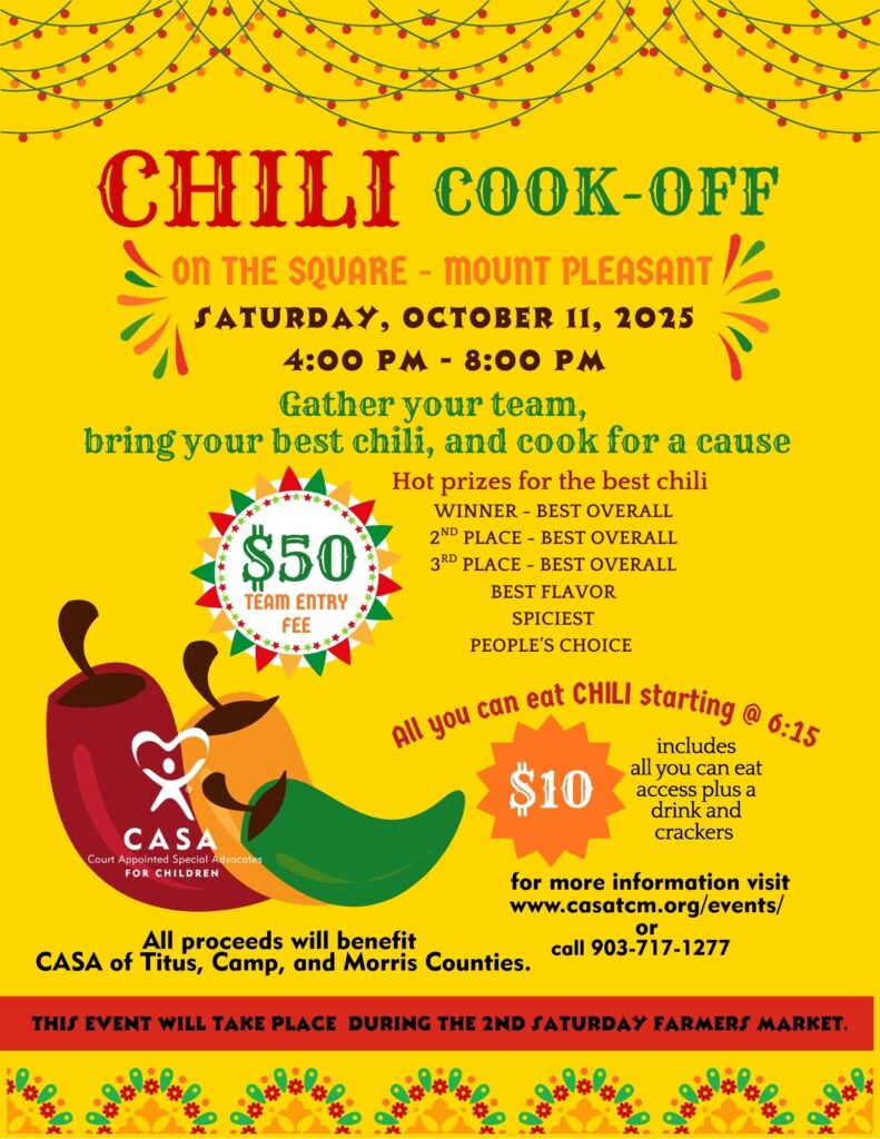 Our small town, big hearts, and even bigger chili recipes are coming together to support CASA of Titus, Camp, and Morris Counties — serving children and families in the foster care system.