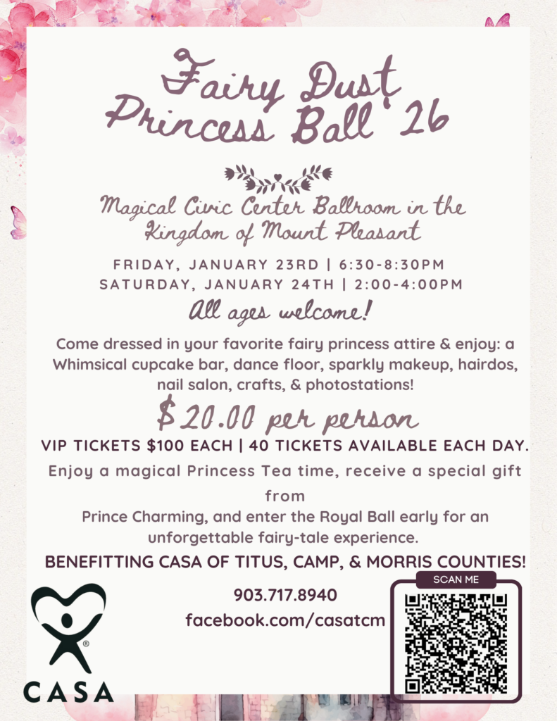 Join CASA of Titus, Camp, and Morris Counties for a magical evening at the Fairy Dust Princess Ball, held in the Magical Ballroom at the Mount Pleasant Civic Center. Little princesses are invited to come dressed in their favorite royal or Disney Princess attire and enjoy an enchanting night to remember!
