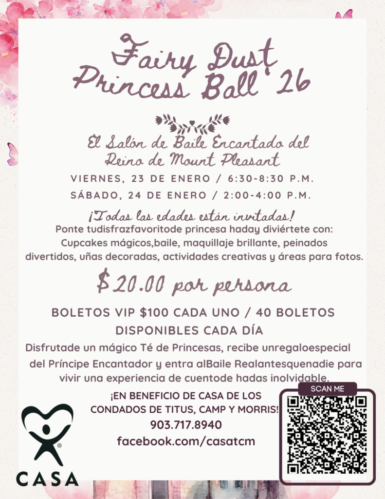 Únase a CASA de los Condados de Titus, Camp y Morris para una velada mágica en el Baile de Princesas Fairy Dust, que se llevará a cabo en el Salón Mágico del Centro Cívico de Mount Pleasant. Se invita a las pequeñas princesas a asistir vestidas con su atuendo real o de Princesa Disney favorito y disfrutar de una noche encantadora e inolvidable.